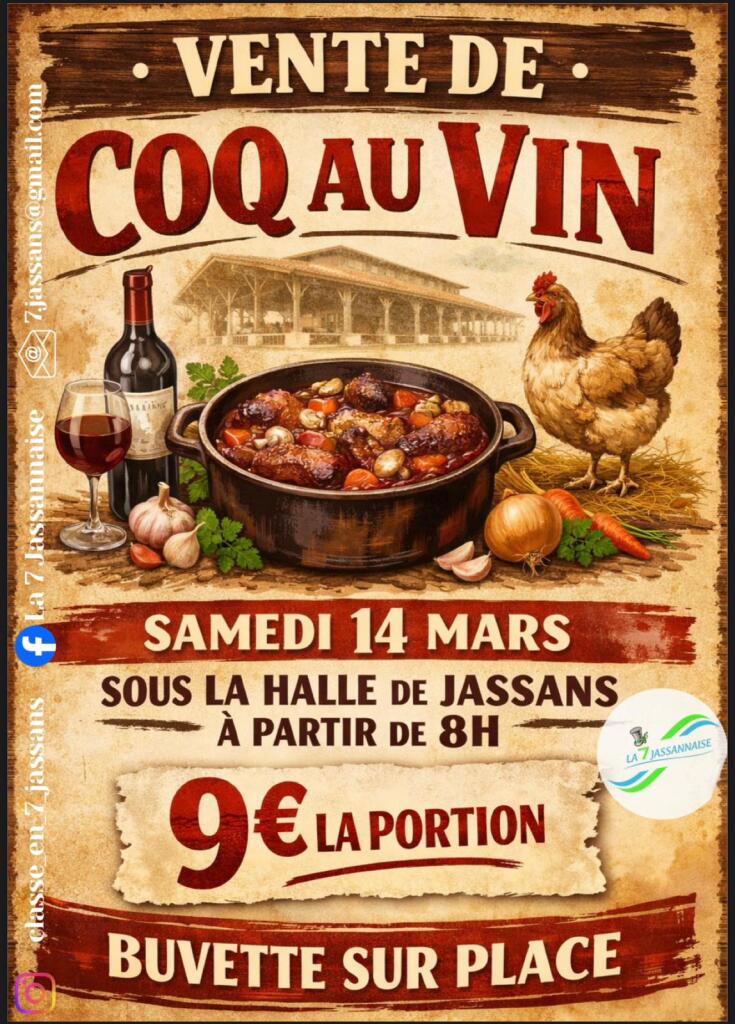 La classe en 7 vous donne rendez-vous pour sa vente de coq au vin le samedi 14 mars dès 8h sous la halle de Jassans.