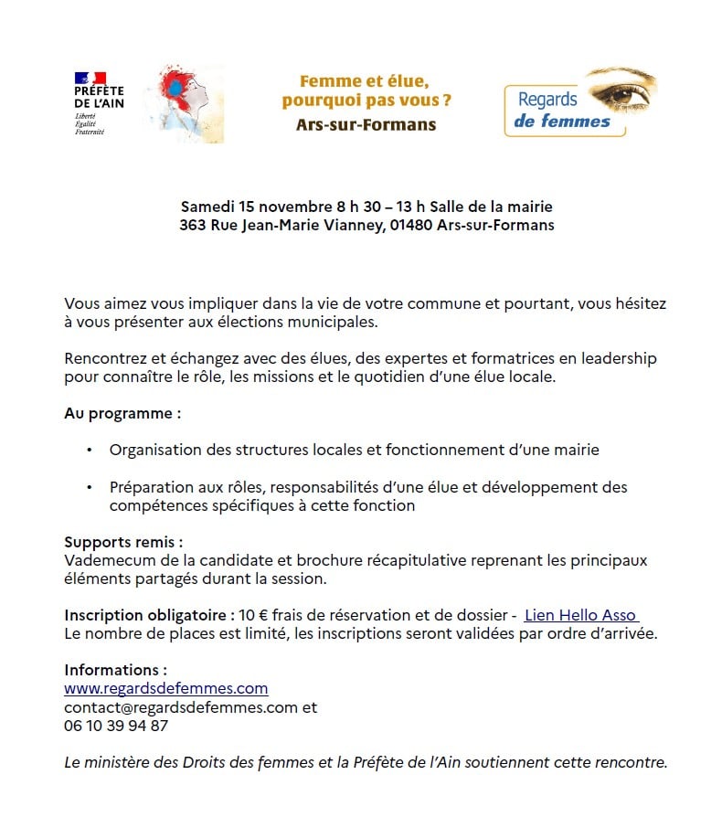 Dans le contexte d’application du scrutin paritaire à toutes les communes, l’association Regards de Femmes, soutenue par l’État, organise dans notre département 3 matinées d’information à l’attention des femmes investies dans la vie économique et sociale de leur commune et souhaitant ou hésitant à se porter candidates aux élections municipales de 2026 : « Femmes et élues, pourquoi pas vous? ».