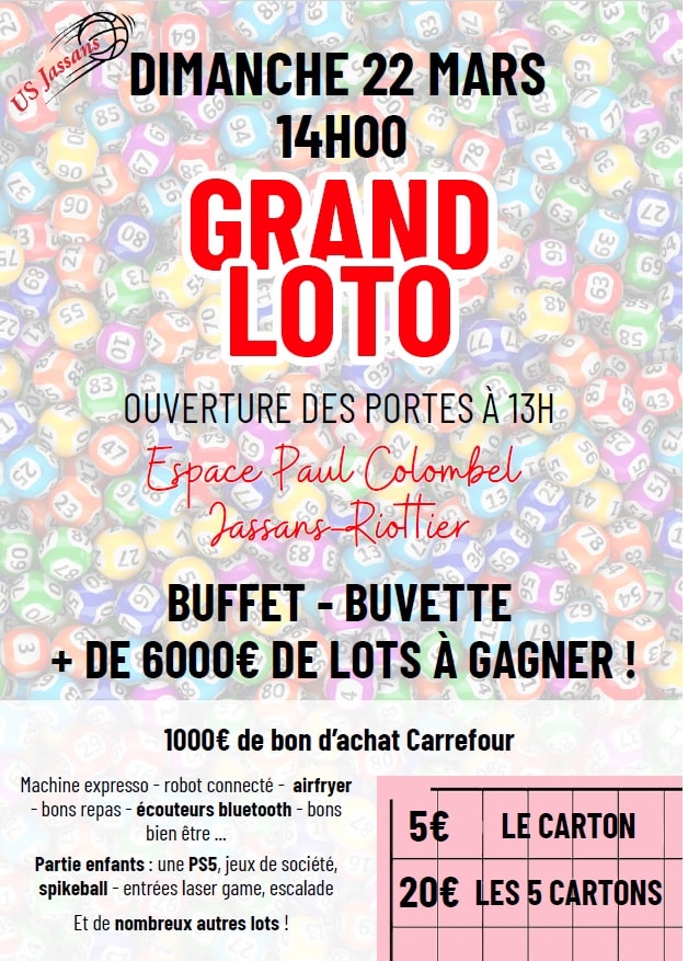 Le club de US JASSANS BASKET organise son super loto annuel: plus de 6000 euros de lots à gagner: 1er prix: 1000 euros de bon d’achats chez Carrefour.