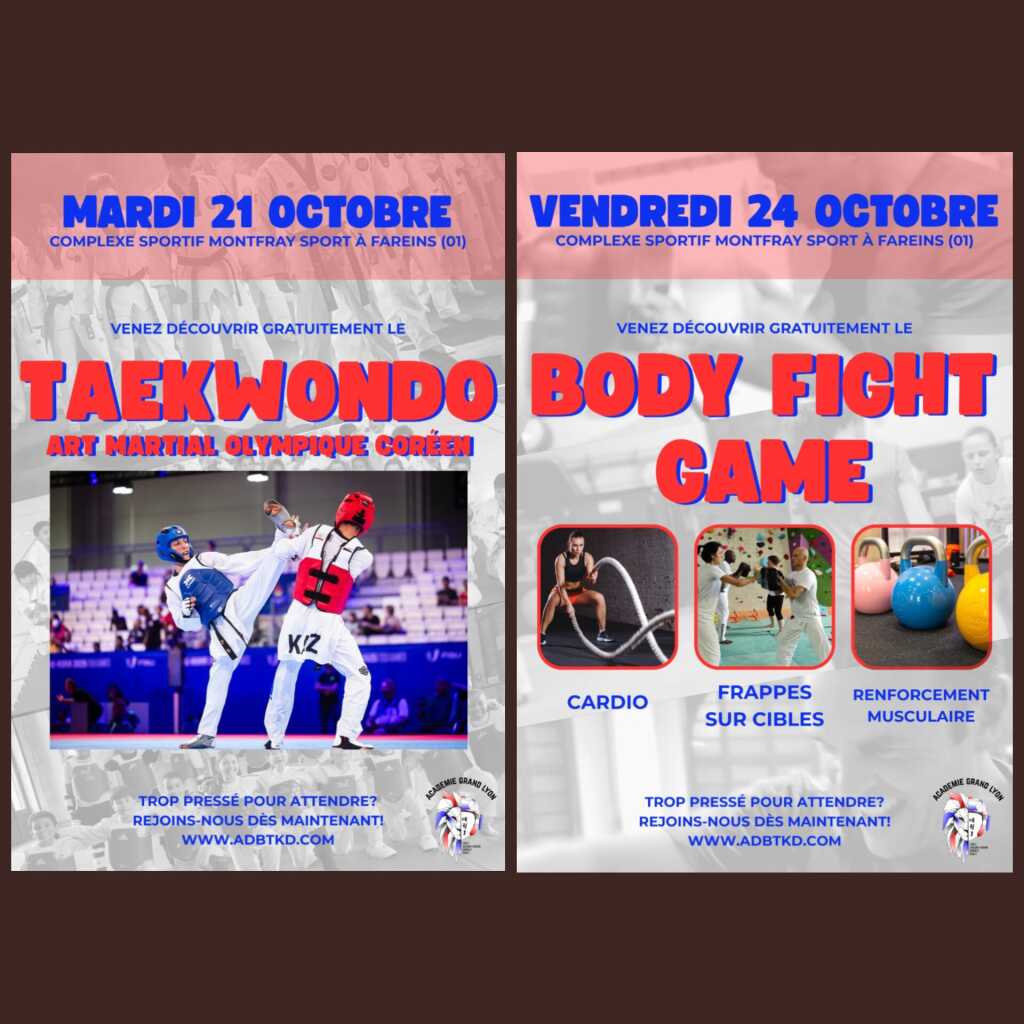nous voudrions faire découvrir notre activité le Body Fight Game LE VENDREDI 24 OCTOBRE , 19H-20H30, sorte de Fitness martial qui combine des exercices cardio-vasculaires, de renforcement musculaire avec des frappes sur cibles, sans avoir besoin de notion technique, le tout en musique et dans la bonne humeur 🙂, ainsi que le taekwondo, LE MARDI 21 OCTOBRE, 20H-21H30 art martial coréen dont le point fort est le travail de jambe mais qui est très complet (frappe sur cible/ self défense/ combat/ confiance en soi/ goût de l’effort)