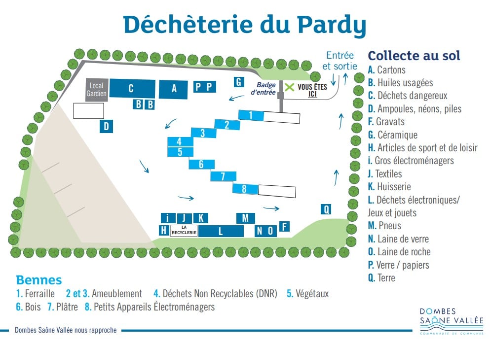 La déchèterie est située dans la Zone Artisanale du Pardy, sur la commune de Frans